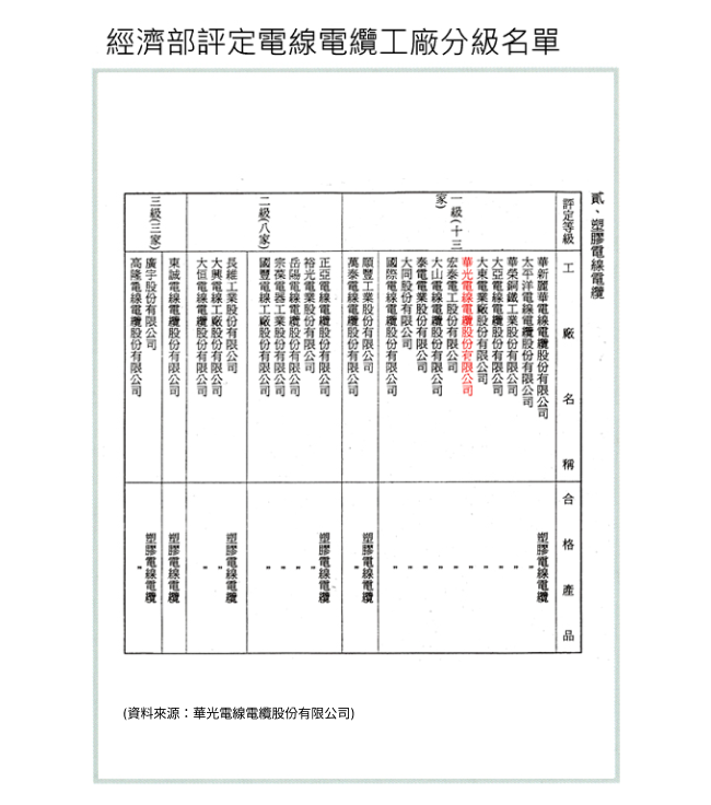 其評比結果,分別為三等級 (一級廠、二級廠、三級廠);華城一律使用華新、麗華、太平洋…等,經濟部評定電線電纜工廠一級廠(十三家)之XLPE 或 PVC電纜。